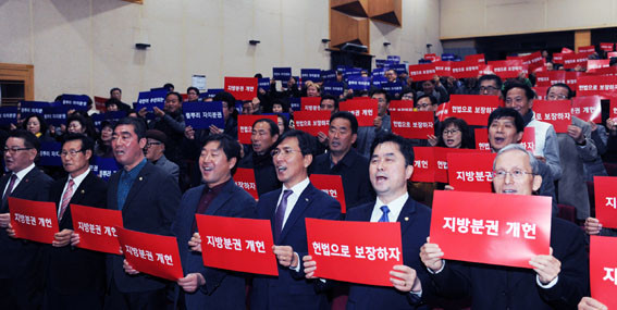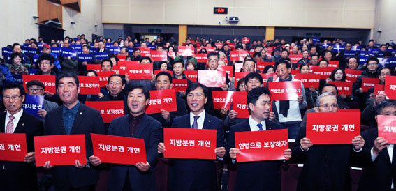 ÀÌ ÀÚ¸®¿¡¼ ¾È Áö»ç´Â ¡°´ëÅë·É°ú ±¹È¸ÀÇ¿øÀÌ ±¹°¡ÀÇ ¹é³â´ë°è¸¦ ³õ°í ÀÏ ÇÒ ¼ö ÀÖµµ·Ï ¸¸µå´Â Çå¹ý °³Á¤, Áß¾ÓÀº Áß¾Ó´ë·Î, Áö¹æÀº Áö¹æ ¿ªÇÒ¿¡ ¸ÂÃç °¢ÀÚÀÇ ±ÇÇѰú Ã¥ÀÓÀ» °®°í È¿°úÀûÀ¸·Î Àß ÀÛµ¿ÇÏ´Â ³ª¶ó ½Ã½ºÅÛÀ» ¸¸µéÀÚ, ±×°Ô ÀÚÄ¡ºÐ±Ç °³Ç塱À̶ó¸ç ÀÚÄ¡ºÐ±Ç °³Çå¿¡ ÈûÀ» ¸ð¾ÆÁÙ °ÍÀ» ´çºÎÇß´Ù.