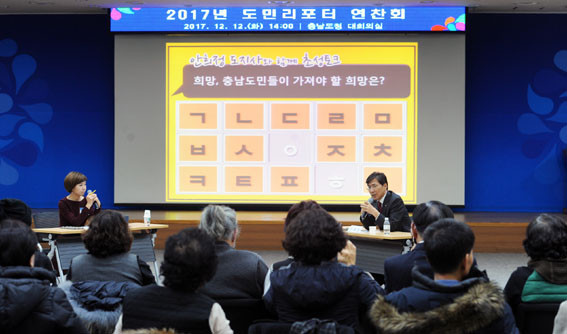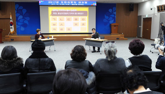 Ãæ³²µµ´Â 12¿ù 12ÀÏ µµÃ» ´ëȸÀǽǿ¡¼ ¾ÈÈñÁ¤ Áö»ç¿Í µµ¹Î¸®Æ÷ÅÍ µî 100¿© ¸íÀÌ Âü¼®ÇÑ °¡¿îµ¥ÀÇ ¡®2017 µµ¹Î¸®Æ÷ÅÍ ¿¬Âùȸ-±×´ë°¡ ¾´´Ù. Ãæ³²ÀÌ ¹Ý¦Àδ١¯¸¦ °³ÃÖÇß´Ù°í ¹àÇû´Ù.