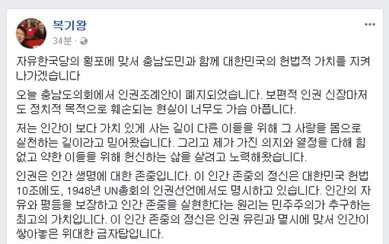 ³¡À¸·Î º¹±â¿Õ ½ÃÀåÀº ¡°À̹ø Ãæ³²µµÀÇȸÀÇ ÀαÇÁ¶·Ê¾È ÆóÁö °áÀÇ´Â ´ëÇѹα¹ Çå¹ý Á¤½ÅÀ» À§¹èÇÏ´Â Æø·ÂÀÌ¸ç º¸ÆíÀû ÀαǽÅÀåÀ» ¹Ù¶ó´Â Ãæ³²µµ¹ÎµéÀÇ ¹ÎÀǸ¦ öÀúÈ÷ ¹«½ÃÇÑ Ã³»ç¡±¶ó¸é¼ ¡°Àú´Â Ãæ³²µµ¹Î°ú ÇÔ²² ÀÚÀ¯Çѱ¹´çÀÇ È¾Æ÷¿¡ ¸Â¼ Àαǿ¡ ´ëÇÑ ´ëÇѹα¹ÀÇ Çå¹ýÀû °¡Ä¡¸¦ ÁöÄѳª°¡°Ú´Ù¡±°í õ¸íÇß´Ù.