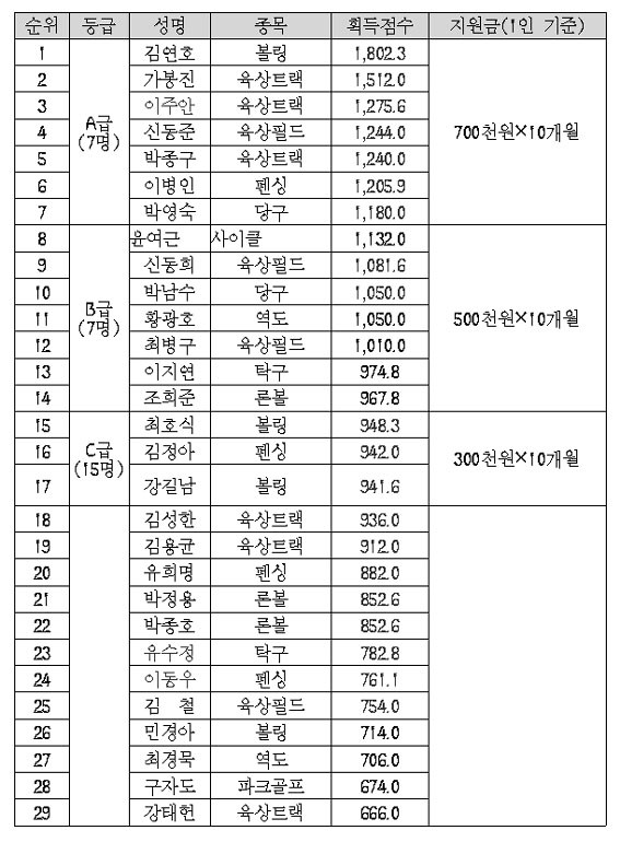 À̹ø ÈÆ·Ãºñ Áö¿ø ´ë»óÀº Áö³ÇØ Àü±¹Àå¾ÖÀÎüÀü¿¡¼ ¿ì¼öÇÑ ¼ºÀûÀ» °ÅµÐ ¼±¼ö¿Í ÆÀÀ¸·Î 2¿ùºÎÅÍ 11¿ù±îÁö ÃÑ 10°³¿ù°£ µî±Þº°·Î ÈÆ·Ãºñ°¡ Â÷µî Áö¿øµÈ´Ù.