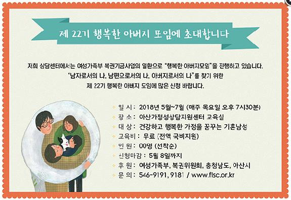 ¹è¹æ»ê ÀÚ¶ô ¼øÃµÇâ·Î1060(°ø¼ö¸®)¿¡ À§Ä¡ÇÑ ´ëÇѰ¡Á¤¹ý·üº¹Áö»ó´ã¿ø ¾Æ»êÁöºÎ ºÎ¼³ ¾Æ»ê°¡Á¤¼º»ó´ãÁö¿ø¼¾ÅÍ¿¡¼´Â ¿À´Â 5¿ù~7¿ù, ¸ÅÁÖ ¸ñ¿äÀÏ ¿ÀÈÄ 7½Ã30ºÐ~9½Ã30ºÐ, 9ÁÖ°£ÀÇ °úÁ¤À¸·Î Á¦ 22±â ¡®ÇູÇÑ ¾Æ¹öÁö¸ðÀÓ¡¯À» ÁøÇàÇÒ ¿¹Á¤ÀÌ´Ù.