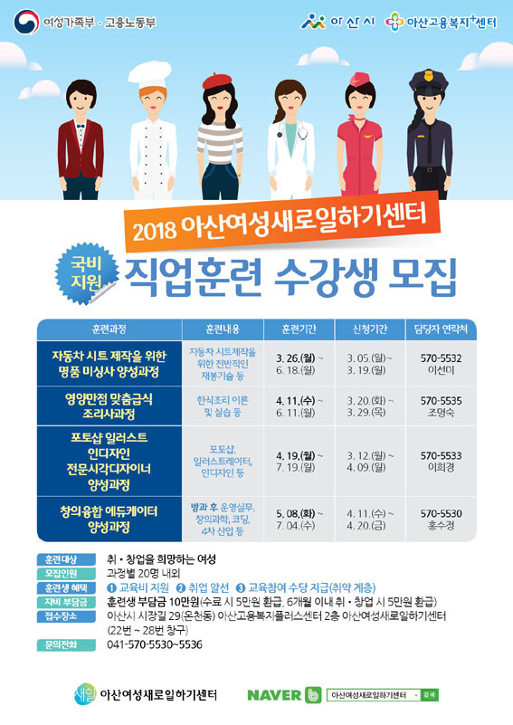 ¾Æ»ê¿©¼º»õÀϼ¾ÅÍ¿¡¼´Â ¡®(Àü¹®±â¼ú)Æ÷Åä¼¥¡¤ÀÏ·¯½ºÆ®¡¤ÀεðÀÚÀÎ Àü¹®½Ã°¢µðÀÚÀÌ³Ê ¾ç¼º°úÁ¤¡¯ À̿ܿ¡ ¡®ÀÚµ¿Â÷½ÃÆ®Á¦ÀÛÀ» À§ÇÑ ¸íǰ¹Ì½Ì»ç¾ç¼º°úÁ¤¡¯Àº 3¿ù 26ÀÏ °³°ÇÏ¸ç ¡®¿µ¾ç¸¸Á¡ ¸ÂÃã±Þ½Ä Á¶¸®»ç°úÁ¤¡¯, ¡®Ã¢ÀÇÀ¶ÇÕ ¿¡µàÄÉÀÌÅÍ ¾ç¼º°úÁ¤¡¯Àº 4~5¿ù Áß °³°¿¹Á¤À¸·Î ÇöÀç ±³À°»ý ¸ðÁý ÁßÀÌ´Ù.