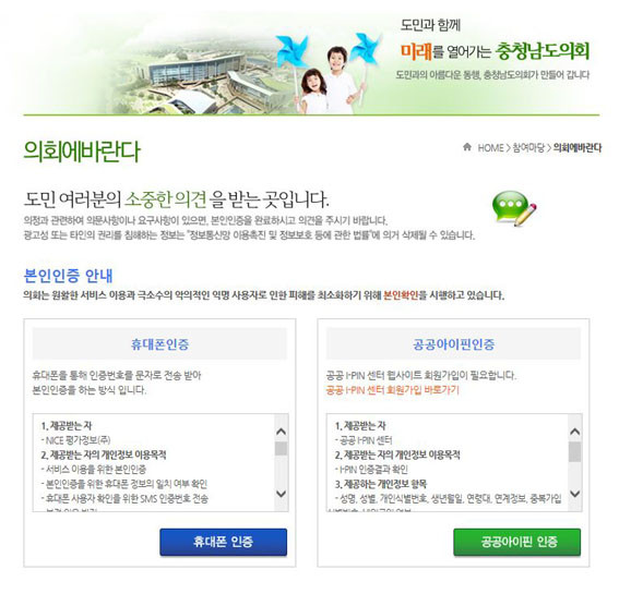 µµÀÇȸ¿¡ µû¸£¸é ±×µ¿¾È µµÀÇȸ ȨÆäÀÌÁö¿¡´Â °ø°ø¾ÆÀÌÇÉ(i-PIN)À¸·Î º»ÀÎÈ®ÀÎÀ» ¸¶Ä£ ÈÄ¿¡¸¸ ÀÇ°ß °³ÁøÀ» ÇÒ ¼ö ÀÖ¾ú´Ù.