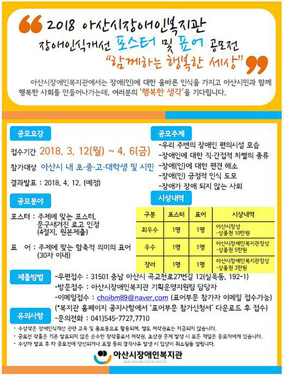 Àå¾ÖÀνݳ¼± °ø¸ðÀü¿¡ ´ëÇÑ ÀÚ¼¼ÇÑ »çÇ×Àº ¾Æ»ê½ÃÀå¾ÖÀκ¹Áö°ü ȨÆäÀÌÁö(www.asanrehab.or.kr)¿¡¼ È®ÀÎ ÇÒ ¼ö ÀÖÀ¸¸ç, ¹®ÀÇ»çÇ×Àº ¾Æ»ê½ÃÀå¾ÖÀκ¹Áö°ü ±âȹ¿î¿µÁö¿øÆÀ ÃÖº´¹® »çȸº¹Áö»ç¿¡°Ô ¹®ÀÇ ÇÏ¸é µÈ´Ù. (¢Ï545-7727 ,7710)