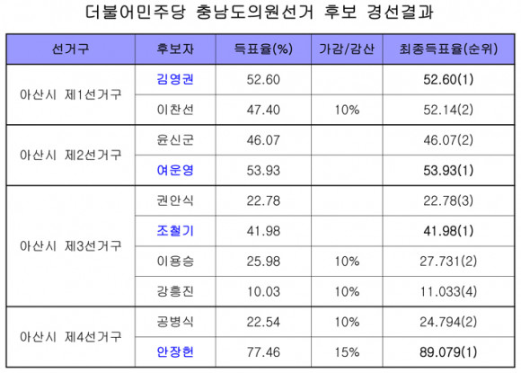 ±Ç¸®´ç¿ø 50%¿Í ÀϹݽùΠ50%ÀÇ ºñÀ²·Î Áý°èÇÑ °æ¼± °á°ú¿¡ µû¸£¸é ¡ã¾Æ»ê½Ã Á¦1¼±°Å±¸(¼±À塤µµ°í¡¤½Å⡤¿Â¾ç4µ¿¡¤¿Â¾ç5µ¿)¿¡¼´Â ±è¿µ±Ç ¡ãÁ¦2¼±°Å±¸(¿Â¾ç1µ¿¡¤¿Â¾ç2µ¿¡¤¿Â¾ç3µ¿¡¤¿Â¾ç6µ¿)¿¡¼´Â ¿©¿î¿µ ¡ãÁ¦3¼±°Å±¸(¿°Ä¡¡¤ÅÁÁ¤¡¤À½ºÀ¡¤µÐÆ÷¡¤¿µÀΡ¤ÀÎÁÖ)¿¡¼´Â Á¶Ã¶±â ¡ãÁ¦4¼±°Å±¸(¹è¹æ¡¤¼Û¾Ç)¿¡¼´Â ¾ÈÀåÇå ¿¹ºñÈ帰¡ 1À§¸¦ Â÷Áö, º»¼±¿¡ ÁøÃâÇß´Ù.