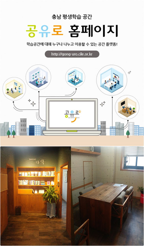 °øÀ¯·Î(ÖØ)´Â ÃæÃ»³²µµ ³» °ø°ø±â°ü ¹× ¹Î°£ÀÇ À¯ÈÞ°ø°£À» ÇнÀ °øÀ¯ °ø°£À¸·Î µî·ÏÇÏ¿© Áö¿ª ÁÖ¹ÎÀÌ °¡±î¿î °Å¸®¿¡¼ ½±°í, ´Ù¾çÇÑ ÇнÀȰµ¿À» ÇÒ ¼ö ÀÖµµ·Ï ¹«·á·Î °øÀ¯ÇÏ´Â °ø°£ Ç÷§ÆûÀÌ´Ù. °ø°£°øÀ¯´Â »ó½Ã°³¹æ ¶Ç´Â ¼±Åð³¹æ(¸ÅÁÖ, ¸ÅÀÏ, ÀÏÁ¤ÇÑ ½Ã°£´ë)ÀÇ ÇüÅ·Π´Ù¾çÇÏ°Ô ÁöÁ¤ÇØ Á¦°øÇÒ ¼ö ÀÖ´Ù.