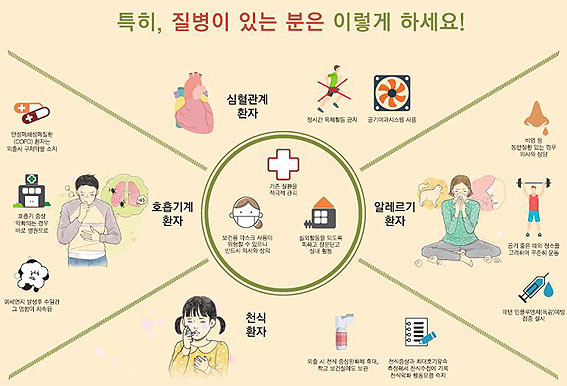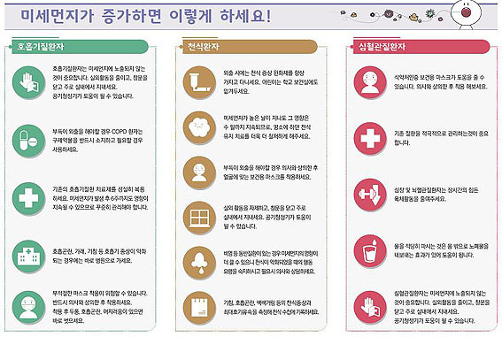 ¹Ì¼¼¸ÕÁö·Î ÀÎÇÑ ÇÇÇØ ¿¹¹æÀ» À§Çؼ´Â ¡â¹Ì¼¼¸ÕÁö ¿¹º¸¸¦ ÁÖ±âÀûÀ¸·Î È®ÀÎÇÏ°í ¡â¹Ì¼¼¸ÕÁö ³óµµ°¡ ³ôÀ» ½Ã ¿ÜÃâ ÀÚÁ¦ ¡â±âÀúÁúȯ ±âÁ¸ Ä¡·á À¯Áö ¡â½Ä¾àó ÀÎÁõ ¹Ì¼¼¸ÕÁö Â÷´Ü ¸¶½ºÅ© Âø¿ë ¡âÁõ»ó ¾ÇÈ ½Ã Áø·á¹Þ±â µîÀ» ÁؼöÇØ¾ß ÇÑ´Ù.
