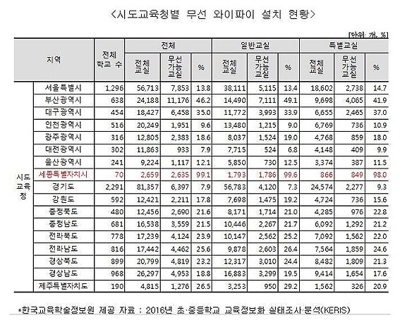 Çѱ¹±³À°ÇмúÁ¤º¸¿ø(2016)ÀÇ ½Ã¡¤µµ±³À°Ã» ¹«¼± ¿ÍÀÌÆÄÀÌ ¼³Ä¡ ÇöȲ Á¶»ç¿¡ µû¸£¸é ¼¼Á¾½Ã´Â 99.1%ÀÎ ¹Ý¸é, Ãæ³²Àº ÃæºÏÀÇ º¸±Þ·ü¿¡µµ µÚ¶³¾îÁö´Â 21.5%ÀÌ´Ù.