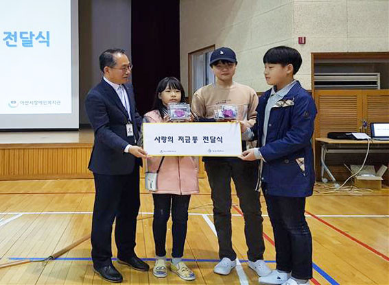 ÇÁ·Î±×·¥ »çÀÌ¿¡ 4ÁÖ°£ ¸ð±ÝÇÑ »ç¶ûÀÇ Àú±ÝÅëÀ» Àü´ÞÇÏ´Â ½Ã°£À» °¡Á³´Ù. À̳¯ ÅÁÁ¤ÃʵîÇб³´Â Ãæ³² À¯ÀÏÀÇ ÈÙü¾îÀå¾ÖÀγ󱸴ÜÀÎ ¡®¾Æ»êÈÙ½ºÆÄ¿ö³ó±¸´Ü¡¯À» À§ÇØ 3¿ù ÃʺÎÅÍ 4¿ù ÃʱîÁö ¾à ÇÑ ´Þ°£ Çлý 500¸íÀÌ ¸ðÀº ÈÄ¿ø±ÝÀ» ¾Æ»ê½ÃÀå¾ÖÀκ¹Áö°ü¿¡ Àü´ÞÇß´Ù.