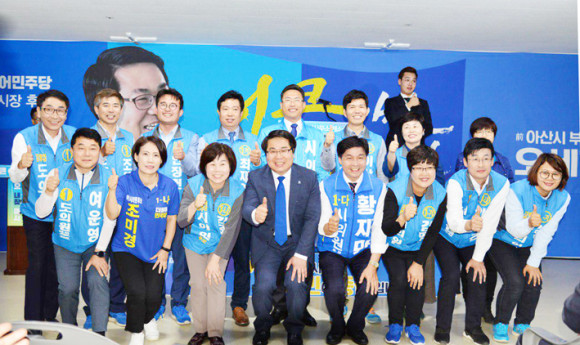 Àλ縻¿¡ ¾Õ¼ ¿À¼¼Çö È帴 6.13Áö¹æ¼±°Å ¾Æ»ê½Ã ½ÃµµÀÇ¿ø Ã⸶ÀÚ Àü¿øÀ» ¼Ò°³ÇÏ´Â ÀÚ¸®¸¦ ¸¶·ÃÇÏ°í ¡°¼±°Å¿îµ¿ ±â°£ ´õºÒ¾î¹ÎÁÖ´ç ¸ðµç Ã⸶ÀÚµé°ú ÇÔ²² ¡®¿øÆÀ¡¯À¸·Î ÈûÀ» ¸ð¾Æ ¹Ýµå½Ã ½Â¸®ÇÏÀÚ¡±°í ´ÙÁüÇß´Ù.