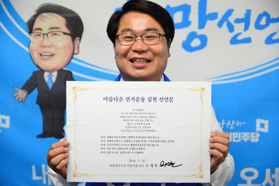 À̹ø ¾Æ¸§´Ù¿î ¼±°Å¿îµ¿ ½Çõ¼±¾ð¹®¿¡¼ ¿À¼¼Çö È帴 ¡°Á¦7ȸ Áö¹æ¼±°Å ¾Æ»ê½ÃÀå Èĺ¸·Î¼ Á¤Ã¥°ú °ø¾à, ±×¸®°í ºñÀüÀ¸·Î °æÀïÇÏ°í ±ú²ýÇÑ ¼±°Å, ¾Æ¸§´Ù¿î °æÀïÀ¸·Î »õ·Î¿î ¼±°Å¹®È Á¶¼º¿¡ ¾ÕÀå¼ ³ª°¥ °Í¡±À» ´ÙÁüÇß´Ù.