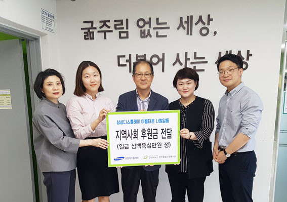 Àü´Þ½Ä¿¡ Âü¿©ÇÑ ±èº´±¹ »ï¼ºµð½ºÇ÷¹ÀÌ ºÎÀåÀº ¡°¹ÙÀÚȸ Çà»ç·Î ¸¶·ÃµÈ À̹ø ¼öÀͱÝÀ» Áö¿ª»çȸ ³» ¾î·Á¿î ÀÌ¿ôµéÀ» À§ÇØ ÀÛÁö¸¸ µµ¿òÀÌ µÇ°í ½Í¾î »ç¿øµé°ú ¶æÀ» ¸ðÀ¸°Ô µÆ´Ù¡±¸ç, ¡°¾ÕÀ¸·Îµµ ±Â³×À̹ö½º ¿ÂÁÖÁ¾ÇÕ»çȸº¹Áö°ü°ú Áö¼ÓÀûÀÎ °ü°è¸¦ ÅëÇØ ´õ ¸¹Àº »çȸ°øÇåȰµ¿À» À̾À¸¸é ÁÁ°Ú´Ù¡±°í ÀüÇß´Ù.