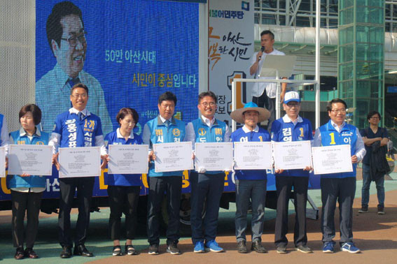 ¼±°Å¿îµ¿¿ø ¹× ÁöÁöÀÚ µî 300¿© ¸íÀÌ ¿îÁýÇÑ °¡¿îµ¥ ÁøÇàµÈ À̳¯ ÃâÁ¤½Ä¿¡¼ ¿À¼¼Çö ¾Æ»ê½ÃÀå Èĺ¸¿Í ´õºÒ¾î¹ÎÁÖ´ç Ã⸶ÀÚµéÀº ¾Æ¸§´Ù¿î ½Çõ¼±¾ð¹®¿¡ ¼¸íÇϰí, ³¡±îÁö °øÁ¤ÇÏ°í ±ú²ýÇÑ ¼±°Å¿îµ¿À» ÅëÇØ À̹ø ¼±°Å¸¦ ¹ÎÁÖÁÖÀÇÀÇ ÃàÁ¦·Î ¸¸µéÀÚ°í °áÀÇÇß´Ù.