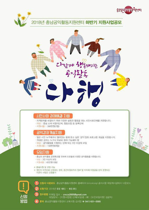 ¸ðÀÓÁö¿ø ºÎ¹®Àº Ãæ³²ÀÇ °øÀÍȰµ¿ ¹®È È®»êÀ» À§ÇÑ µµ¹ÎµéÀÇ ´Ù¾çÇÑ °øÀÍȰµ¿À» Áö¿øÇϸç, 3ÀÎ ÀÌ»óÀÇ ¸ðÀÓÀ̶ó¸é ´©±¸³ª Á¢¼ö °¡´ÉÇÏ´Ù. ÃÑ 10ÆÀÀ» ¼±Á¤ÇØ °¢ 40¸¸ ¿øÀ» Áö¿øÇÑ´Ù.