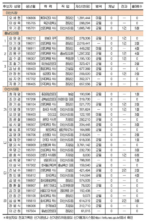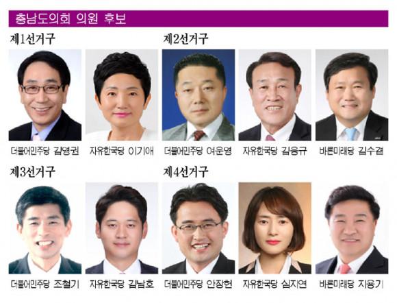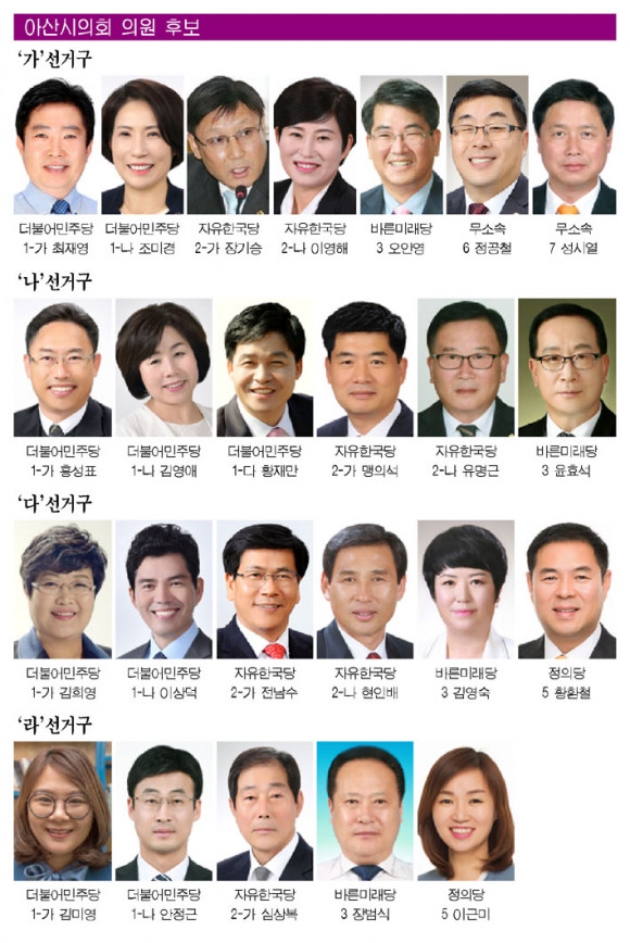 À̵éÀº ¾Æ»ê½ÃÀå¼±°Å¿¡ ¿À¼¼Çö¡¤ÀÌ»ó¿í¡¤À¯±âÁØ Èĺ¸ µî 3¸í, Ãæ³²µµÀÇ¿ø¼±°Å¿¡ ±è¿µ±Ç¡¤À̱â¾Ö(Á¦1¼±°Å±¸), ¿©¿î¿µ¡¤±èÀÀ±Ô¡¤±è¼ö°â(Á¦2¼±°Å±¸), Á¶Ã¶±â¡¤±è³²È£(Á¦3¼±°Å±¸), ¾ÈÀåÇ塤½ÉÁö¿¬¡¤Áö¿ë±â(Á¦4¼±°Å±¸) Èĺ¸ µî 10¸í, ¾Æ»ê½ÃÀÇ¿ø Èĺ¸¿¡ ¡®°¡¡¯¼±°Å±¸ 7¸í, ¡®³ª¡¯¼±°Å±¸ 6¸í, ¡®´Ù¡¯¼±°Å±¸ 6¸í, ¡®¶ó¡¯¼±°Å±¸ 5¸í(ÃÑ 24¸í) µîÀÌ´Ù.