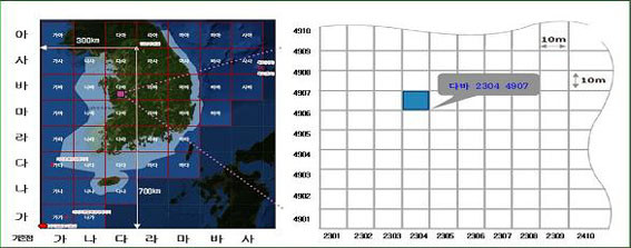 ±¹°¡ÁöÁ¡¹øÈ£´Â ¿ì¸®³ª¶ó Àü ±¹Åä ¹× ÀÌ¿Í ÀÎÁ¢ÇÑ ÇØ¾çÀ» ±×¹°¸Áó·³ °ÝÀÚÇüÀ¸·Î ±¸È¹ÇÏ°í °¢ ÁöÁ¡¸¶´Ù ¹øÈ£¸¦ ºÎ¿©ÇÑ °ÍÀ¸·Î, 100§° ´ÜÀ§·Î ¹®ÀÚ¸¦ ºÎ¿©Çϰí, ÀÌÇÏ 10§°, 1§°, 100m, 10m ´ÜÀ§±îÁö´Â °ÝÀÚÇüÀ¸·Î ¹øÈ£¸¦ ºÎ¿©ÇÑ ¹ü±¹°¡Àû À§Ä¡Ç¥½Ãü°è´Ù.