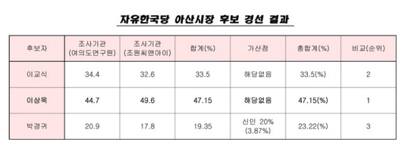 5ÀÏ ¿ÀÈÄ¿¡ ¹ßÇ¥ÇÑ °æ¼± °á°ú ÀÌ»ó¿í(Àü ¼»ê½Ã ºÎ½ÃÀå) ¿¹ºñÈ帰¡ 47.15%¸¦ ¾ò¾î, À̱³½Ä(¾Æ»ê½ÃÁ¤¿¬±¸¿øÀå) ¿¹ºñÈĺ¸(33.5%)¿Í ¹Ú°æ±Í(¾Æ»êÂü¿©ÀÚÄ¡¿¬±¸¿øÀå) ¿¹ºñÈĺ¸(23.22%(°¡»êÁ¡ 20% ÇÕ°è))¸¦ Á¦Ä¡°í ÀÚÀ¯Çѱ¹´ç ¾Æ»ê½ÃÀå È帷Π³ª¼°Ô µÆ´Ù.