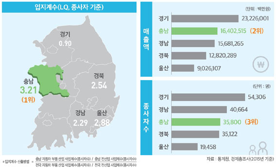 ±×¸®°í 2015³â ±âÁØ Ãæ³²ÀÇ ÀÚµ¿Â÷ºÎǰ»ê¾÷ ¸ÅÃâ¾×Àº ¾à16Á¶4õ¾ï ¿øÀ¸·Î °æ±â¿¡ À̾î 2À§ ±Ô¸ð¿´°í, Á¾»çÀÚ¼ö´Â 3¸¸ 5õ800¸íÀ¸·Î °æ±â¿Í °æ³²¿¡ À̾î 3À§¸¦ ´Þ¸®°í ÀÖ´Ù.