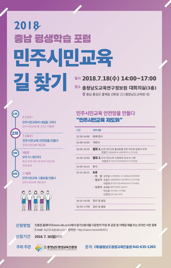 Æ÷·³¿¡´Â ¹ÎÁֽùα³À°¿¡ °ü½É ÀÖ´Â ±â°ü¡¤´Üü °ü°èÀÚ, Ȱµ¿°¡, Çлý, Çкθð, ÀϹݽùΠµî ´©±¸³ª Âü¿©ÇÒ ¼ö ÀÖ´Ù. ½Åû¹æ¹ý µî º¸´Ù ÀÚ¼¼ÇÑ ³»¿ëÀº Ãæ³²Æò»ý±³À°ÁøÈï¿ø ȨÆäÀÌÁö(http://www.cile.or.kr)¸¦ ÅëÇØ È®ÀÎÇÏ¸é µÈ´Ù.