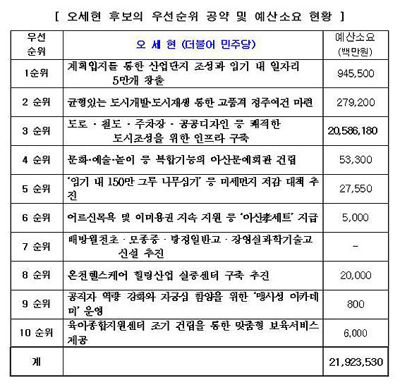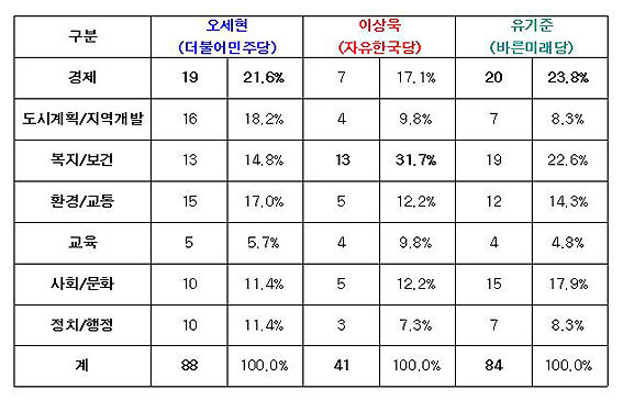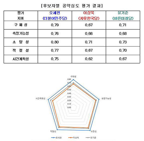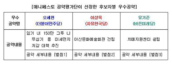 ¿À¼¼Çö Èĺ¸ÀÇ °ø¾à Áß¿¡¼´Â ¡®Àӱ⠳» 150¸¸ ±×·ç ³ª¹«½É±â µî ¹Ì¼¼¸ÕÁö Àú°¨ ´ëÃ¥ ÃßÁø¡¯, ÀÌ»ó¿í Èĺ¸ÀÇ °ø¾à Áß¿¡¼´Â ¡®¾Æ»ê¹®È¿¹¼úȸ°ü °Ç¸³¡¯, À¯±âÁØ Èĺ¸ÀÇ °ø¾à Áß¿¡¼´Â ¡®Ä¡¸ÅÁö¿ø¼¾ÅÍ ¼³¸³¡¯ °ø¾àÀÌ Æò°¡´ÜÀÌ ¼±Á¤ÇÑ ¿ì¼ö°ø¾àÀ¸·Î ºÐ¼®µÆ´Ù.