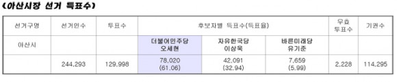 ¾Æ»ê½ÃÀå ¼±°ÅÀÇ °æ¿ì ¹ÎÁÖ´çÀÇ ¿À¼¼Çö Èĺ¸¿Í ÀÚÀ¯Çѱ¹´ç(ÀÌÇÏ Çѱ¹´ç)ÀÇ ÀÌ»ó¿í Èĺ¸, ¹Ù¸¥¹Ì·¡´ç(ÀÌÇÏ ¹Ì·¡´ç)ÀÇ À¯±âÁØ Èĺ¸ µî 3ÆÄÀüÀ¸·Î Ä¡·¯Áø °á°ú ¿À¼¼Çö È帰¡ 61.06%(7¸¸ 8õ20Ç¥)ÀÇ µæÇ¥·Î ÀÌ»ó¿í(32.94%, 4¸¸ 2õ91Ç¥)¡¤À¯±âÁØ(5.99%, 7õ659Ç¥) È常¦ ¾ÐµµÀûÀ¸·Î ´·¶´Ù.
