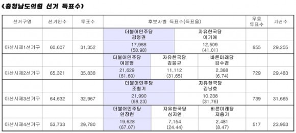 ¼±°Å±¸º°·Î »ìÆì º¸¸é ¡®°¡¡¯¼±°Å±¸´Â ¹«·Á 7¸í, ±×Áß¿¡¼µµ µµÀÇ¿ø, ½ÃÀÇȸ ÀÇÀå, Çö¿ª ½ÃÀÇ¿ø 2¸í µî 4¸íÀÌ ¸ô·Á ½ÃÀå¼±°Å º¸´Ù ´õ Ä¡¿ÇÑ °÷À¸·Î Æò°¡µÆ´Âµ¥ 6ȸ Áö¹æ¼±°Å¿¡¼ ³«¼±ÀÇ ¾ÆÇÄÀ» ¸ÀºÃ´ø ¹ÎÁÖ´ç ÃÖÀ翵 È帰¡ 37.95%(1¸¸ 1õ288Ç¥)ÀÇ ³ôÀº µæÇ¥À²·Î 1À§¸¦ Â÷ÁöÇß´Ù. À̾î Çѱ¹´ç Àå±â½Â È帰¡ 18.90%(5õ624Ç¥)·Î 2À§, ¹ÎÁÖ´ç Á¶¹Ì°æ È帰¡ 13.38%(3õ982Ç¥)·Î 3À§¸¦ Â÷ÁöÇÏ¸é¼ ½ÃÀÇȸ ÀÔ¼º¿¡ ¼º°øÇß´Ù.