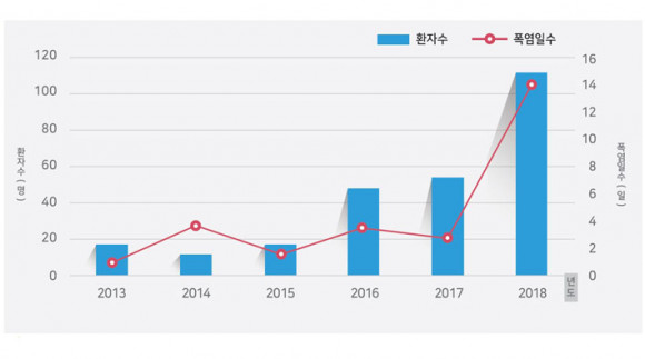2013³â¿¡ ¿Â¿ÁúȯÀÚÀÚ 17¸íÀÎ °Í°ú ºñ±³Çϸé 6¹è°¡ ³Ñ´Â ¼öÄ¡´Ù. Æø¿°Àϼö´Â ÀÏ ÃÖ°í±â¿ÂÀÌ 33¡É ÀÌ»óÀÎ ³¯ÀÇ ¼öÀ̸ç, ¿Â¿ÁúȯÀº ¿»çº´, ¿Å»Áø, ¿°æ·Ã, ¿½Ç½Å, ¿ºÎÁ¾ µîÀÇ Áõ»óÀ» ¸»ÇÑ´Ù.