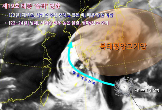 ÅÂdz ¡®¼Ö¸¯¡¯ÀÌ Á¢±ÙÇÔ¿¡ µû¶ó ´ëÀüÁö¹æ±â»óûÀº ¿À´Â 22ÀÏ ÈĹݿ¡ Á¦ÁÖµµ¿¡ ºñ°¡ ½ÃÀÛµÅ, 23~24ÀÏ¿¡´Â Àü±¹¿¡ ºñ°¡ ³»¸®°Ú°í ƯÈ÷, Á¦ÁÖµµ¿Í ³²ÇؾÈÀº ÁöÇüÀûÀÎ ¿µÇâÀ¸·Î ¸Å¿ì °ÇÑ ºñ¿Í ÇÔ²² ¸Å¿ì ¸¹Àº ºñ°¡ ³»¸®´Â °÷ÀÌ ÀÖ°Ú°í, ÃÖ´ë¼ø°£Ç³¼Ó 40m/s(144km/h) ÀÌ»óÀÇ ¸Å¿ì °ÇÑ ¹Ù¶÷ÀÌ ºÒ°ÚÀ¸´Ï, °¢Á¾ ½Ã¼³¹°°ü¸® ¹× ¾ÈÀü»ç°í¿¡ °¢º°È÷ À¯ÀÇÇϱ⠹ٶõ´Ù°í ¹àÇû´Ù.