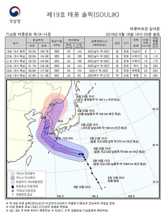 ´ëÀüÁö¹æ±â»óûÀº Áö³ 8¿ù 16ÀÏ ¿ÀÀü 9½Ã°æ, ±¡ ºÏ¼ÂÊ ¾à 260km ºÎ±Ù ÇØ»ó¿¡¼ ¹ß»ýÇÑ Á¦19È£ ÅÂdz ¡®¼Ö¸¯(SOULIK)¡¯Àº Áö³ 8¿ù 19ÀÏ ¿ÀÈÄ 3½Ã ÇöÀç °ÇÑ ÁßÇü ÅÂdz(Á߽ɱâ¾Ð 955hPa, ÃÖ´ëdz¼Ó 40m/s(144km/h))À¸·Î ÀϺ» °¡°í½Ã¸¶ ³²µ¿ÂÊ ¾à 1õ80km ºÎ±Ù ÇØ»óÀ» Áö³ª ¼³²¼ÁøÇϰí ÀÖ´Ù°í ¹àÇû´Ù.