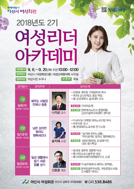 ¾Æ»ê½Ã ¿©¼ºÈ¸°ü(°üÀå ±Ç¼ø¹Ì)Àº ¿À´Â 9¿ù 6ÀϺÎÅÍ 20ÀϱîÁö (¸ÅÁÖ ¸ñ¿äÀÏ ¿ÀÀü 10½Ã~12½Ã) ¿©¼ºÈ¸°ü 3Ãþ ¿©¼º´ÜüÇùÀÇȸ »ç¹«½Ç¿¡¼ Á¦2±â ¿©¼º¸®´õ ¾ÆÄ«µ¥¹Ì¸¦ ¿î¿µÇÑ´Ù.