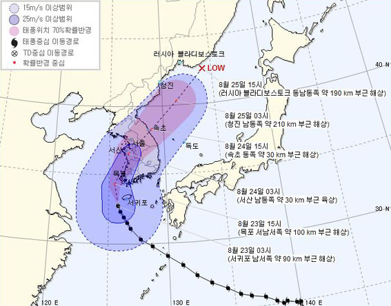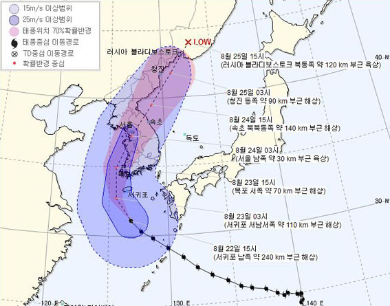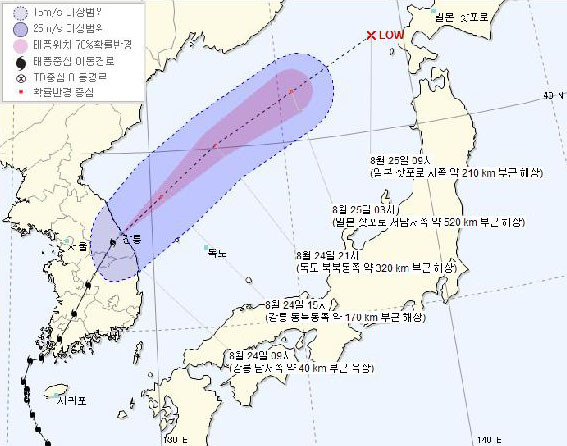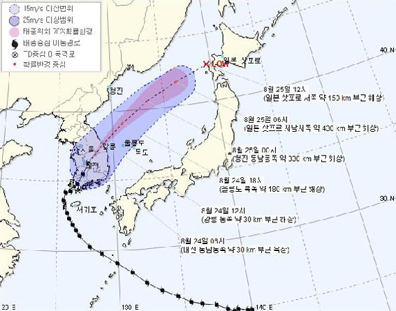 ±â»óûÀÌ ¹ßÇ¥ÇÑ Áö³ 8¿ù 22ÀÏÀÇ ¡®¼Ö¸¯¡¯ ¿¹»óÁø·Î¸¦ º¸¸é 23ÀÏ ÀÚÁ¤²² žȹݵµ·Î »ó·úÇØ ³»·úÀ» °üÅëÇÏ´Â °ÍÀ¸·Î ³ªÅ¸³ª ÀÖ´Ù. ÅÂdzÀº °¡ÀåÀÚ¸® ºÎ±ÙÀÌ °¡Àå Å« ÇÇÇØ¸¦ Áִµ¥ ±×Áß¿¡¼µµ ¿À¸¥ÂÊ °¡ÀåÀÚ¸®´Â Ä¡¸íÀûÀÎ ÇÇÇØ¸¦ ¾È°ÜÁشٴÙ. ÅÂdzÀÇ Á߽ɺΰ¡ Å¾ȹݵµ¸¦ ÈȰí Áö³ª°£´Ù°í °¡Á¤ ÇßÀ» ¶§ ¾Æ»êÁö¿ªÀº ´«ÀÇ ¿À¸¥ÂÊ¿¡ ÀÚ¸®ÇØ ÀûÁö¾ÊÀº ÇÇÇØ°¡ ¿¹»óµÆ´Ù.