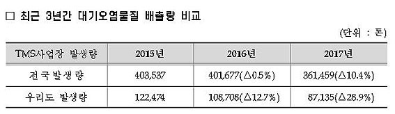 µµ°¡ ÃÖ±Ù µµ³» ±¼¶Ò ÀÚµ¿ÃøÁ¤±â(TMS) ºÎÂø »ç¾÷Àå 61°÷ÀÇ ´ë±â¿À¿°¹°Áú ¹èÃâ·®À» ºÐ¼®ÇÑ °á°ú¿¡ µû¸£¸é, Áö³ÇØ ÃÑ ¹èÃâ·®Àº 8¸¸ 7135ÅæÀ¸·Î Áý°èµÆ´Ù.