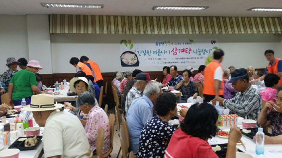 À̳¯ À½ºÀ¸é ÇູŰ¿òÃßÁø´ÜÀº ¾î¸£½Å 200¿©¸íÀ» ´ë»óÀ¸·Î ¾î¸£½ÅµéÀÌ ¹«´õ¿î ¿©¸§À» °Ç°ÇÏ°Ô Áö³»½Ã±æ ¹Ù¶ó´Â ¸¶À½À¸·Î Á¤¼º½º·¹ ÁغñÇÑ »ï°èÅÁ°ú À½ºÀ³óÇù¿¡¼ ÈÄ¿ø¹ÞÀº ¼ö¹Ú°ú À½·á µî ¿µ¾ç½ÄÀ¸·Î À½½ÄÀ» Á¦°øÇß´Ù.