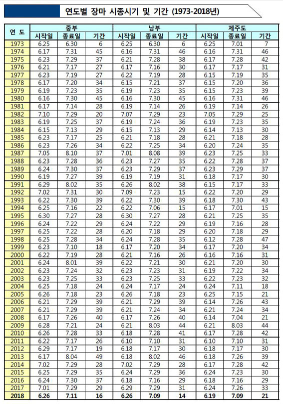 | | ¨Ï ¿Â¾ç½Å¹® | | À帶 ½ÃÀÛÀÏÀº Á¦ÁÖµµ°¡ Æò³â°ú ºñ½ÁÇß°í, ³²ºÎÁö¹æÀº Æò³âº¸´Ù 3ÀÏ ´Ê°Ô, ÁߺÎÁö¹æÀº 1~2ÀÏ ´Ê°Ô ½ÃÀ۵ƴÙ. ¹Ý¸é¿¡ À帶°¡ Æò³âº¸´Ù 11~15ÀÏ Á¤µµ ÀÏÂï Á¾·áµÅ À帶±â°£ÀÌ 1973³â ÀÌ·¡ µÎ ¹øÂ°·Î ª¾Ò´Ù. (°¡Àå ªÀº À帶Àº 1973³â, Á¦ÁÖµµ 6¿ù 25ÀÏ¡7¿ù 1ÀÏ(7ÀÏ), ³²ºÎ¿Í ÁߺΠ6¿ù 25¡30ÀÏ(6ÀÏ)À̾úµð)