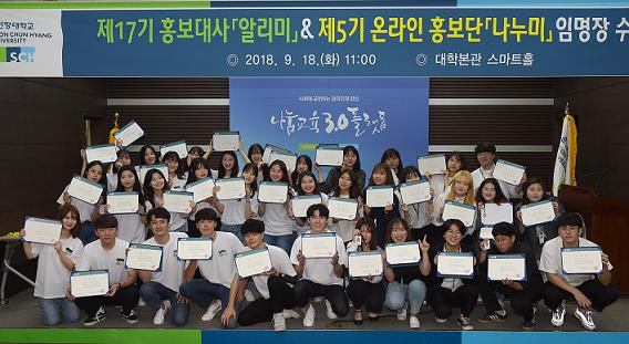 | | ¡è¡è ¡ã18ÀÏ ¿ÀÀü, ¼øÃµÇâ´ë ±³³» ´ëÇк»°ü ½º¸¶Æ®È¦¿¡¼ ¡®Á¦17±â È«º¸´ë»ç ¾Ë¸®¹Ì¡¯ 20¸í°ú ¡®Á¦5±â ¿Â¶óÀÎ È«º¸´Ü ³ª´©¹Ì¡¯ 15¸íÀÌ ½Å±Ô·Î ¼±¹ßµÅ ÀÓ¸íÀåÀ» ¹Þ°í º»°ÝÀûÀΠȰµ¿¿¡ ³ª¼¹´Ù. (»çÁø=¼øÃµÇâ´ë Á¦°ø) | ¨Ï ¿Â¾ç½Å¹® | | ¼øÃµÇâ´ëÇб³(ÃÑÀå ¼±³ÀÏ)´Â Áö³ 9¿ù 18ÀÏ ¿ÀÀü ±³³» ´ëÇк»°ü ½º¸¶Æ®È¦¿¡¼ ¡®Á¦17±â È«º¸´ë»ç ¾Ë¸®¹Ì¡¯¿Í ¡®Á¦5±â ¿Â¶óÀÎ È«º¸´Ü ³ª´©¹Ì¡¯ÀÇ ÀÓ¸íÀåÀ» ¼ö¿©½ÄÀ» °³ÃÖÇϰí, º»°ÝÀûÀΠȰµ¿¿¡ ³ª¼¹´Ù°í ¹àÇû´Ù.
