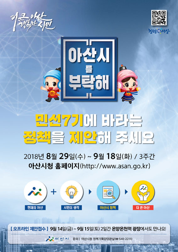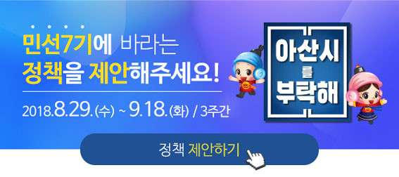 ½Ã¹Î »ýȰ°ú ¹ÐÁ¢ÇÑ Á¤Ã¥, ¾Æ»ê½Ã ¹ßÀüÀ» À§ÇÑ Ã¢ÀÇÀûÀÎ ¾ÆÀ̵ð¾î µîÀ» ¾Æ»ê½Ã¹Î ´©±¸³ª ½Ã ȨÆäÀÌÁö(http://www.asan.go.kr) ³»¿¡ ¸¶·ÃµÈ ¿Â¶óÀÎ Á¦¾ÈÁ¢¼ö ⱸ¸¦ ÅëÇØ Á¦¾ÈÇÒ ¼ö ÀÖ´Ù.
