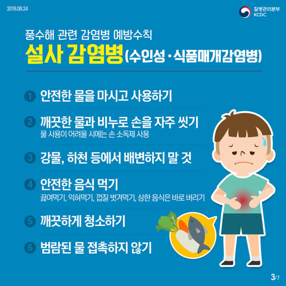 ¸ÕÀú ¼öÀμº¡¤½Äǰ¸Å°³°¨¿°º´ ¿¹¹æÀ» À§Çؼ´Â ¡ãÈ帣´Â ¹°¿¡ 30ÃÊ ÀÌ»ó ¿Ã¹Ù¸¥ ¼Õ ¾Ä±â ¡ãÀ½½Ä¹°Àº ÃæºÐÈ÷ °¡¿ÇØ ¼·ÃëÇϱ⠡ãÁ¶¸®ÇÑ À½½ÄÀº ¿À·¡ º¸°üÇÏÁö ¾Ê±â ¡ã¼³»ç Áõ»óÀ̳ª ¼Õ¿¡ »óó°¡ ÀÖ´Â »ç¶÷Àº À½½ÄÀ» Á¶¸®ÇÏÁö¸»±â µî ¿¹¹æ¼öÄ¢À» ÁؼöÇØ¾ß ÇÑ´Ù.
