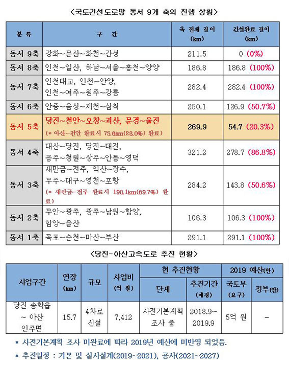 °ÈÆ½Ä ÀÇ¿ø¿¡ µû¸£¸é, ¡®´çÁø-¾Æ»ê¡¯ÀÌ Æ÷ÇÔµÈ ±¹Åä°£¼±µµ·Î¸Á 5ÃàÀÇ °³¹ßÀÌ °¡Àå ´õµò °ÍÀ¸·Î ³ªÅ¸³µ´Ù. ±¹Åä°£¼±µµ·Î¸ÁÀº ±¹ÅäÀÇ µ¿¼±¸°£À» ÀÕ´Â 9°³ Ãà, ³²°ú ºÏÀ» ÀÕ´Â 7°³ ÃàÀ» ±â¹ÝÀ¸·Î °í¼Óµµ·Î¸¦ °Ç¼³ÇÏ´Â ±¹Åä °èȹÀÇ ÀÏȯÀÌ´Ù.