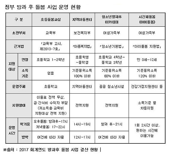 ÀÏ·Ê·Î ±³À°ºÎ, º¸°Çº¹ÁöºÎ, ¿©¼º°¡Á·ºÎ µîÀÌ ÃʵîÇб³ Çзɱ⠾Ƶ¿¿¡ ´ëÇÑ µ¹º½¼ºñ½º Áö¿ø »ç¾÷À» °¢°¢ ½Ç½ÃÇϰí Àִµ¥ ÃʵîÇб³ Çзɱ⠾Ƶ¿ÀÌ ÀÌ¿ëÇÒ ¼ö ÀÖ´Â ´ëÇ¥ÀûÀÎ µ¹º½¼ºñ½º¿¡´Â ±³À°ºÎÀÇ Ãʵº½±³½Ç°ú º¸°Çº¹ÁöºÎ°¡ ¿î¿µÇÏ´Â Áö¿ª¾Æµ¿¼¾ÅÍÀÇ Ãʵº½¼ºñ½º, ¿©¼º°¡Á·ºÎÀÇ Ã»¼Ò³â ¹æ°úÈÄ ¾ÆÄ«µ¥¹Ì¿Í ¾ÆÀ̵¹º½Áö¿ø »ç¾÷ÀÇ ÀÏȯÀ¸·Î Áö¿øÇÏ´Â ½Ã°£Á¦ µ¹º½ µîÀÌ Áߺ¹¡¤À¯»ç º¹Áö»ç¾÷À¸·Î ÁöÀû¹Þ°í ÀÖ´Ù.