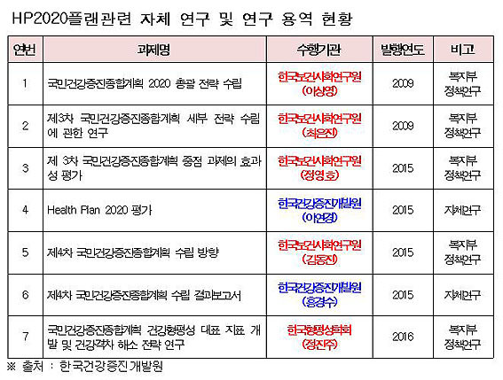 ¡®±¹¹Î°Ç°ÁõÁø¹ý¡¯ Á¦4Á¶¿¡´Â ¡®±¹¹ÎÀÇ °Ç°ÁõÁø¡¤Áúº´¿¹¹æÀ» À§ÇÑ °Ç°ÁõÁø Á¤Ã¥ÀÇ ¹æÇâÀ» Á¦½ÃÇÏ´Â ¹üÁ¤ºÎÀû ÁßÀå±â Á¾ÇÕ°èȹÀÎ ±¹¹Î°Ç°ÁõÁøÁ¾ÇÕ°èȹÀ» 10°³³â ±âÁØÀÇ Á¾ÇÕ°èȹÀ¸·Î ¼ö¸³Çϰí 5³â¸¶´Ù ¼öÁ¤°èȹÇÑ´Ù¡¯°í µÅ ÀÖ´Ù. ±×·¯³ª ÁÖ ¼öÇà±â°üÀÎ Çѱ¹°Ç°ÁõÁø°³¹ß¿øÀº ÀÚü ¼öÇàÇØ¾ß ÇÒ ¿¬±¸»ç¾÷À» Ÿ ±â°ü¿¡ À§Å¹¿¬±¸ ½ÃŰ´Â µî ¼öÇà ÀÇÁö°¡ ¾ø°Å³ª ¿ª·®ÀÌ ¾ø´Â °ÍÀ¸·Î ³ªÅ¸³µ´Ù.