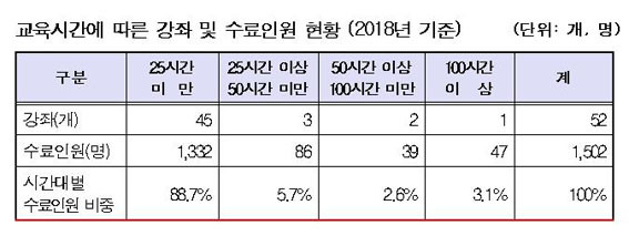 Ãß°¡·Î ±³À°½Ã°£¿¡ µû¸¥ °Á ¹× ¼ö·áÀοø ÇöȲÀ» »ìÆìº¸¸é, 25½Ã°£ ¹Ì¸¸ °Á¿¡ Àüü ¼ö·á»ýÀÇ 88.7%ÀÎ 1õ332¸íÀÌ ÁýÁߵŠÀÖ´Â °ÍÀ¸·Î ³ªÅ¸³µ´Ù. ÀÌ´Â 2016³â 68% ´ëºñ ´Ü±â°Á¿¡ ¼ö·á»ý ÁýÁßÀÌ ½ÉÈµÈ °ÍÀÌ´Ù.