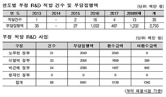 ¿¬±¸ºñ Áõ°¡¿Í µ¢´Þ¾Æ ¿¬±¸±â°üµéÀÌ ±â¼ú°³¹ßÀ» À§ÇØ Áö¿ø¹ÞÀº ¿¬±¸ºñ¸¦ ¸ñÀû ¿Ü·Î ºÎÁ¤ÇÏ°Ô »ç¿ëÇÏ´Â °æ¿ìµµ Áö¼ÓÀûÀ¸·Î ¹ß»ýÇϰí ÀÖ´Â »óȲÀÌ´Ù. ºÎÁ¤ R&D·Î Àû¹ßµÈ °Ç¼ö´Â 2013³â¿¡ 1°ÇÀ̾úÁö¸¸ 2016³â¿¡´Â 16°Ç, 2018³â ÇöÀç¿¡¸¸ 13°ÇÀÌ´Ù. ÃÖ±Ù 5³â°£ ºÎ´çÇÏ°Ô ÁýÇàµÈ ±Ý¾×¸¸ 28¾ï ¿ø¿¡ ´ÞÇÑ´Ù.
