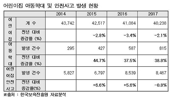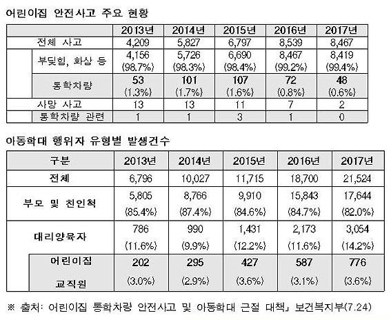 ÇöÀç ¾î¸°ÀÌÁý ¾Æµ¿ÇÐ´ë ¹× ¾ÈÀü»ç°í°¡ ¸Å³â Áõ°¡Çϰí ÀÖ´Â °ÍÀ¸·Î ³ªÅ¸³µ´Ù. ¹®Á¦´Â ¾î¸°ÀÌÁý ¼ö°¡ 2014³â 4¸¸ 3õ742°³¼Ò¿¡¼ 2017³â 4¸¸ 238°³¼Ò·Î ¸Å³â ²ÙÁØÈ÷ °¨¼ÒÇϰí ÀÖ´Â ¹Ý¸é, º¸À°±³Á÷¿øÀÇ ¾Æµ¿ÇÐ´ë ¹ß»ý °Ç¼ö´Â 2014³â 295°Ç¿¡¼ 2017³â 815°ÇÀ¸·Î ¸Å³â Áõ°¡Çϰí ÀÖ´Â °ÍÀ¸·Î ³ªÅ¸³µ´Ù.