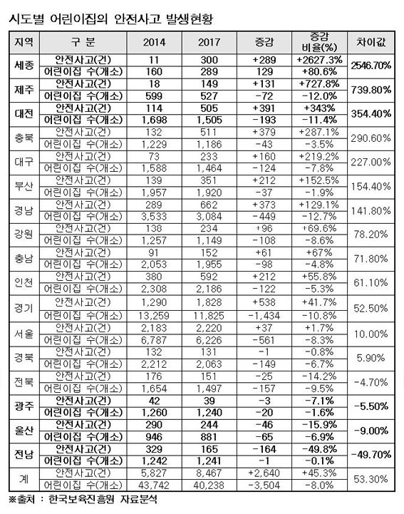 ƯÈ÷ ¼¼Á¾, Á¦ÁÖ, ´ëÀüÁö¿ªÀÇ °æ¿ì 14³â ´ëºñ 17³â¿¡ ¾î¸°ÀÌÁý ¾ÈÀü»ç°í ¹ß»ý ¼ö°¡ Å©°Ô Áõ°¡ÇÑ °ÍÀ¸·Î ³ªÅ¸³µ´Ù. ¼¼Á¾ Áö¿ª ¾î¸°ÀÌÁý ¼ö´Â 2014³â 160°³¿¡¼ 2017³â 289°³·Î 129°³(+80.6%) Áõ°¡ÇÑ ¹Ý¸é, ¾ÈÀü»ç°í´Â 2014³â¿¡ 11°Ç¿¡¼ 2017³â 300°ÇÀ¸·Î 289°Ç(+2627.3%) Áõ°¡ÇÏ¿© ¾ÈÀü»ç°í ¹ß»ý°Ç¼ö°¡ °¡Àå Å©°Ô Áõ°¡ÇÏ¿´´Ù.