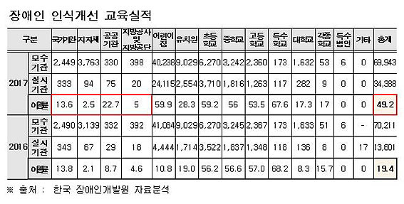 À̸í¼ö ÀÇ¿øÀÇ ÁöÀû¿¡ µû¸£¸é, Àå¾ÖÀκ¹Áö¹ý»ó ±³À° ÀÌÇà ±ÔÁ¤ÀÌ Àû¿ëµÈ 2016³â¿¡´Â ±³À° ÀÌÇà·üÀÌ 19.4%¿´°í, 2017³â¿¡´Â 49.2%·Î Áõ°¡´Â ÇßÁö¸¸, ±¹°¡±â°ü, ÁöÀÚü µîÀÇ Âü¿©°¡ ÀúÁ¶ÇÑ °ÍÀ¸·Î ³ªÅ¸³µ´Ù. ¿©¼º°¡Á·ºÎ°¡ ¿î¿µÇÏ´Â 4´ë Æø·Â¿¹¹æ±³À° ÀÌÇà·ü 99.5%¿Í´Â ´ëºñµÇ´Â ±³À° ÀÌÇà·üÀÌ´Ù.