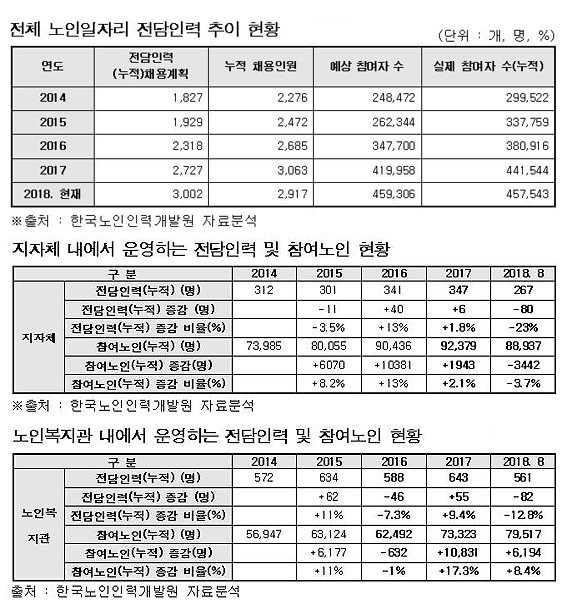 ¶ÇÇÑ ³ëÀκ¹Áö°üÀÇ °æ¿ì 2018³â 8¿ù ±âÁØÀ¸·Î Àü´ãÀη ¼ö°¡ 561¸íÀ¸·Î 17³â 643¸í ´ëºñ 82¸í(-12.8%) °¨¼ÒÇÑ °Í¿¡ ¹ÝÇØ ³ëÀÎÀÏÀÚ¸®»ç¾÷ Âü¿© ³ëÀÎ ¼ö´Â 2018³â 8¿ù ±âÁØÀ¸·Î 7¸¸ 9õ517¸íÀ¸·Î 2017³â 7¸¸ 3õ323¸í ´ëºñ 6õ194¸í(+8.4%) Áõ°¡Çß´Ù. Àü´ãÀη ¼ö°¡ °¨¼ÒÇÑ ¹Ý¸é, Âü¿©³ëÀÎ ¼ö´Â Áõ°¡ÇÑ °ÍÀ¸·Î ³ªÅ¸³µ´Ù.