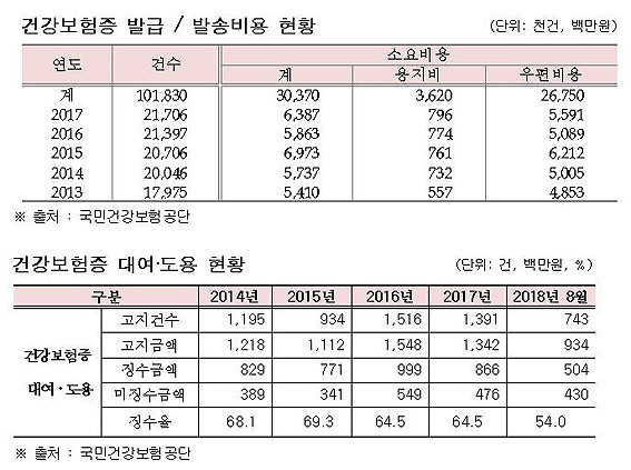 ±¹¹Î°Ç°º¸Çè°ø´ÜÀÌ À̸í¼ö À§¿øÀå¿¡°Ô Á¦ÃâÇÑ ÀÚ·á¿¡ µû¸£¸é, 2013³â~2017³â 5³â°£ °Ç°º¸ÇèÁõÀÌ 1¾ï 183¸¸°Ç ¹ß±ÞµÆ°í ÃÑ 303¾ï 7õ¸¸ ¿ø(¿ëÁöºñ 36¾ï 2õ¸¸ ¿ø + ¿ìÆíºñ¿ë 267¾ï 5õ¸¸ ¿ø)ÀÌ ¼Ò¿äµÆ´Ù.