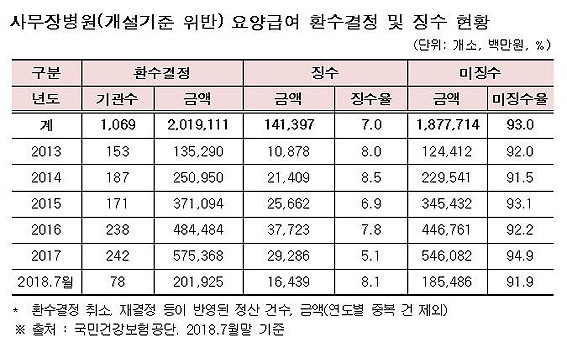±¹¹Î°Ç°º¸Çè°ø´ÜÀÌ À̸í¼ö À§¿øÀå¿¡°Ô Á¦ÃâÇÑ ÀÚ·á¿¡ µû¸£¸é, »ç¹«À庴¿ø ¿ä¾ç±Þ¿© ȯ¼ö°áÁ¤ ÇöȲÀº 2013³â~2018³â 7¿ù±îÁö ÃÑ 1õ69°³¼Ò, 2Á¶ 1õ91¾ï ¿øÀ̸ç, ÀÌ Áß 1õ413¾ï ¿øÀ» ¡¼öÇÏ¿© Àüü ¡¼öÀ²ÀÌ 7.0%·Î ³ªÅ¸³µ´Ù. 2017³â ±âÁØ 242°³¼Ò 5õ753¾ï ¿øÀÇ È¯¼ö°áÁ¤ ±Ý¾× Áß 292¾ï¿øÀ» ¡¼öÇá 5.1% ¡¼öÀ²À» ³ªÅ¸³Â´Ù.