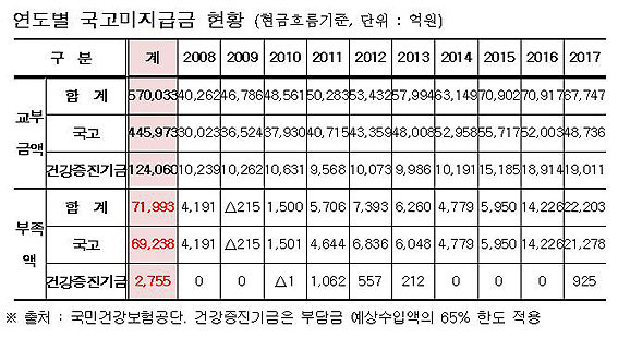 ±¹¹Î°Ç°º¸Çè°ø´ÜÀÌ À̸í¼ö À§¿øÀå¿¡°Ô Á¦ÃâÇÑ ÀÚ·á¿¡ µû¸£¸é, ¿¬µµº° ±¹°í¹ÌÁö±Þ±Ý ÇöȲÀÌ 2008³â~2017³â ¾à 10³â µ¿¾È ±¹°í 6Á¶ 9õ238¾ï ¿ø, °Ç°ÁõÁø±â±Ý 2õ755¾ï ¿ø µî ÃÑ 7Á¶ 1õ993¾ï ¿øÀÇ ¹ÌÁö±Þ±ÝÀÌ ¹ß»ýÇÑ °ÍÀ¸·Î ³ªÅ¸³µ´Ù.