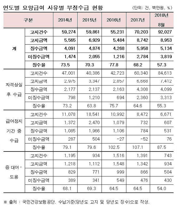 ±¹¹Î°Ç°º¸Çè°ø´ÜÀÌ À̸í¼ö À§¿øÀå¿¡°Ô Á¦ÃâÇÑ ÀÚ·á¿¡ µû¸£¸é, ¿ä¾ç±Þ¿© ºÎÁ¤¼ö±Þ¿¡ ´ëÇÑ Â¡¼öÀ²ÀÌ 2014³â 73.5%, 2015³â 70.3%, 2016³â 77.8%, 2017³â 68.2%, 2018³â 8¿ù 57.3%·Î 2016³â ¡¼öÀ²ÀÌ Àá±ñ Áõ°¡Çß´Ù°¡ ²ÙÁØÈ÷ °¨¼ÒµÇ°í ÀÖ´Â °ÍÀ¸·Î ³ªÅ¸³µ´Ù.